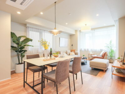 東南角部屋につき、明るい光が差し込むリビング・ダイニング