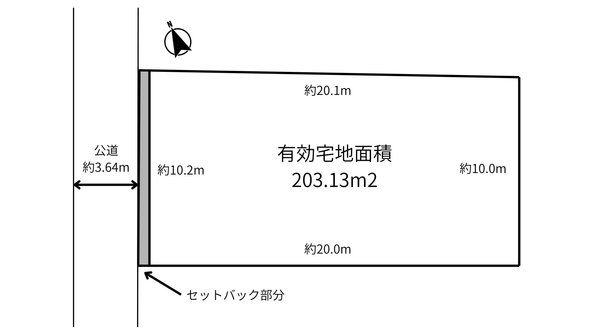 本地は北西側約3.6m道路に接道し、間口は約10.2mあるため、建物のプランニングがしやすい整形地です。